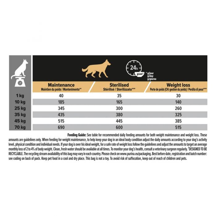 Purina PRO PLAN Light / Sterilised dry dog food is made with high quality chicken pieces as the first ingredient and optimised protein and fat levels. A lower fat content helps promote weight loss. When combined with a daily walk, this food is proven to enable a body fat loss of up to 60% within 12 weeks and healthy subsequent weight maintenance thanks to the high protein and low fat content. The careful formulation, a high protein content, complex carbohydrate sources and adequate fibre content, helps reduce the feeling of hunger.