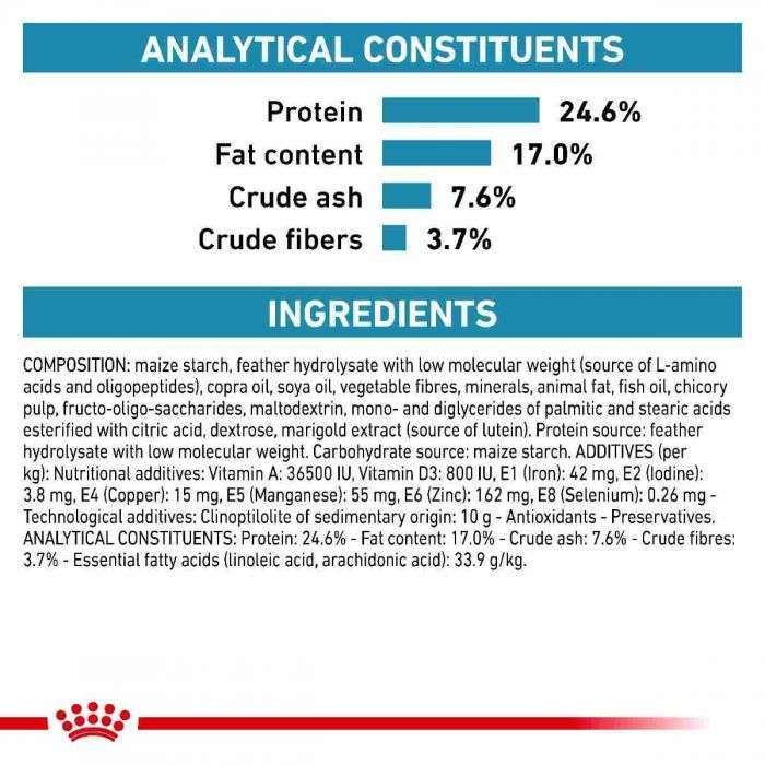 Ingredients: Maize starch, feather hydrolysate with low molecular weight (source of L amino acids and oligopeptides), copra oil, soya oil, vegetable fibres, minerals, animal fat, fish oil, chicory pulp, fructo-oligo-saccharides, maltodextrin, mono and diglycerides of palmitic and stearic acids esterified with citric acid, dextrose, marigold extract (source of protein: feather hydrolysate with low molecular weight (source of L-amino acids of lutein). Crude ash: 8%. Crude fibre: 3.7%. Crude oil fats: 17%. Moisture: 5.5%. Protein: 24.6%.