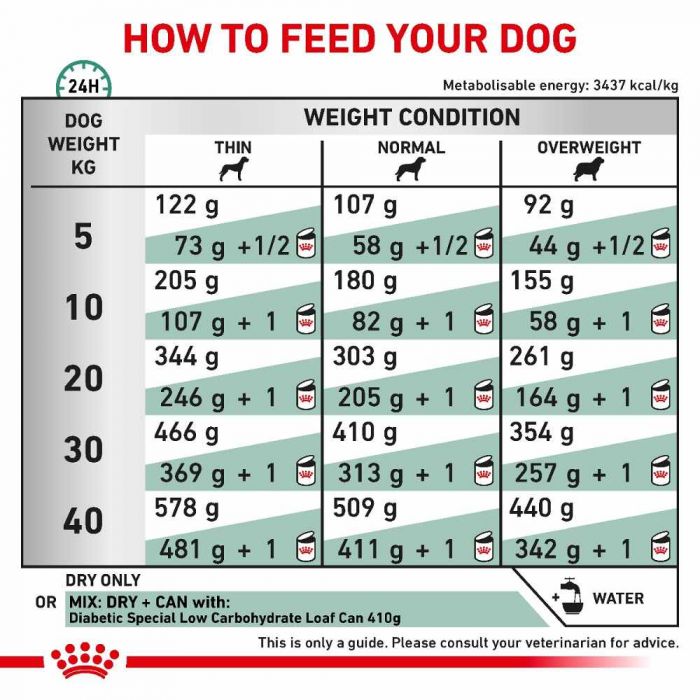 Royal Canin Veterinary Diet Canine Diabetic Dry (DS 37) is a complete dietetic feed for dogs formulated to regulate glucose supply (Diabetes Mellitus). This feed contains a low level of rapid glucose releasing carbohydrates.