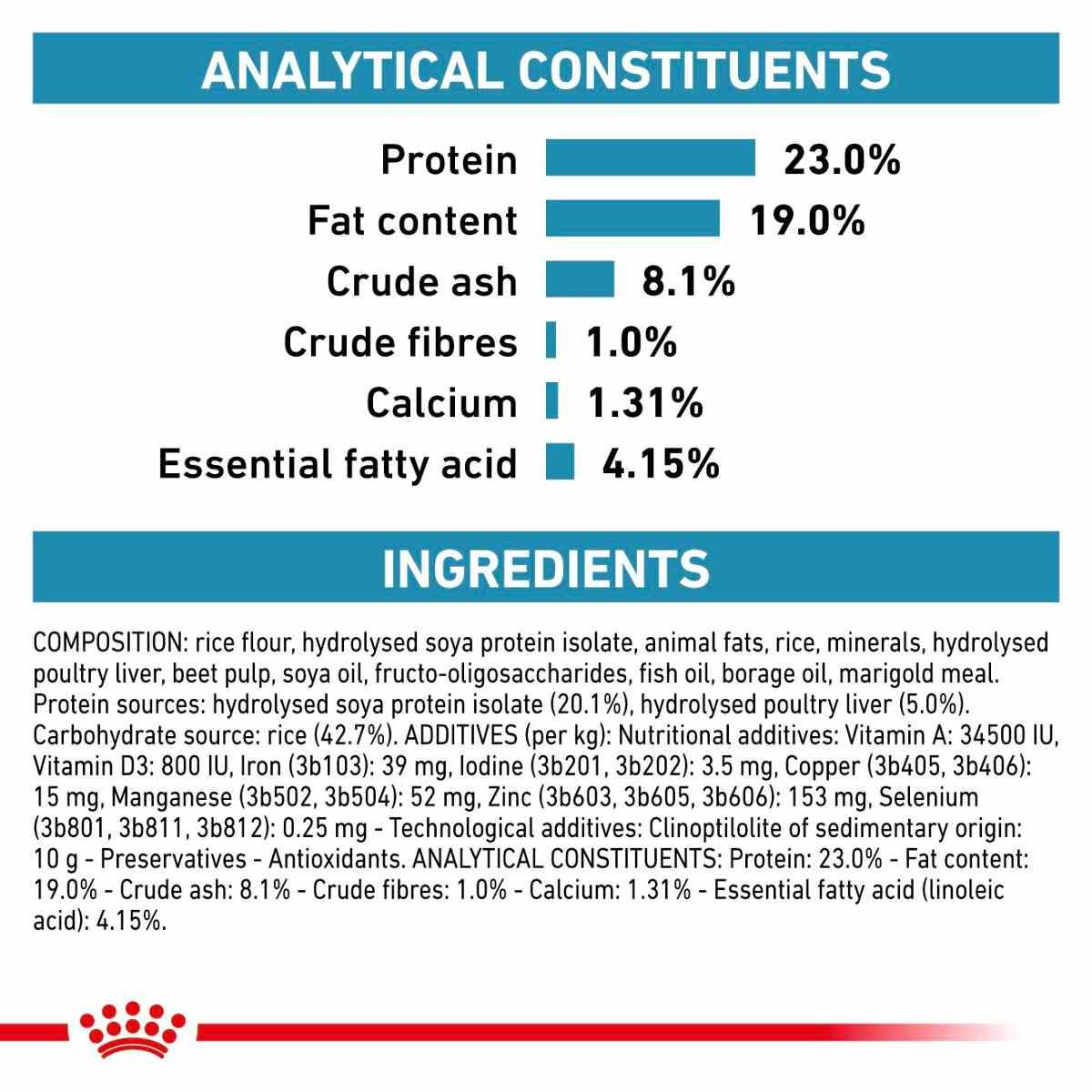 COMPOSITION Rice flour, hydrolysed soya protein isolate, animal fats, rice, hydrolysed poultry liver, beet pulp, minerals, soya oil, fructo-oligosaccharides, fish oil, borage oil, marigold meal. Protein sources: hydrolysed soya protein isolate (17.6%), hydrolysed poultry liver (5.0%). Carbohydrate sources: rice (48.1%).