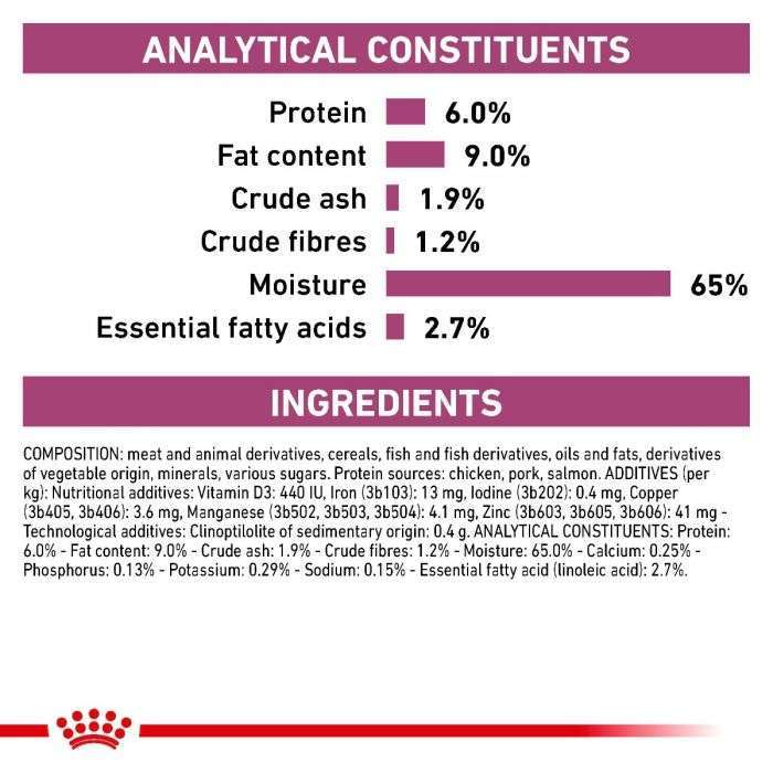 Nutritional information: Crude ash: 1.9%. Crude fibre: 1.2%. Crude oil fats: 9%. Moisture: 65%. Protein: 6%.